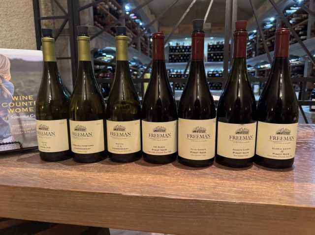 2021 Freeman Pinot Noir, Yu-Ki Estate, West Sonoma Coast, CA: Retail $74. In 2007, Ken bought 50 acres of an old redwood forest above the town of Occidental. It is illegal to cut down redwoods now but in the 1860 this was cleared for sheep grazing but still surrounded by ancient redwoods (one translation of “Yu-KI” is “big tree”). Planted in 2008, this vineyard is a mere 3.5 miles from the ocean. Akiko says it’s more of an umami-driven wine and has more of an ocean influence with thicker skins. Gorgeous red fruit but a bit darker than the other two both in color and style. The fruit, although a bit more subdued than the boisterous nose, continues onto the palate, which is surprisingly round and meaty, with a salty, umami character that really comes through. Fantastic. Outstanding. 93 Points.