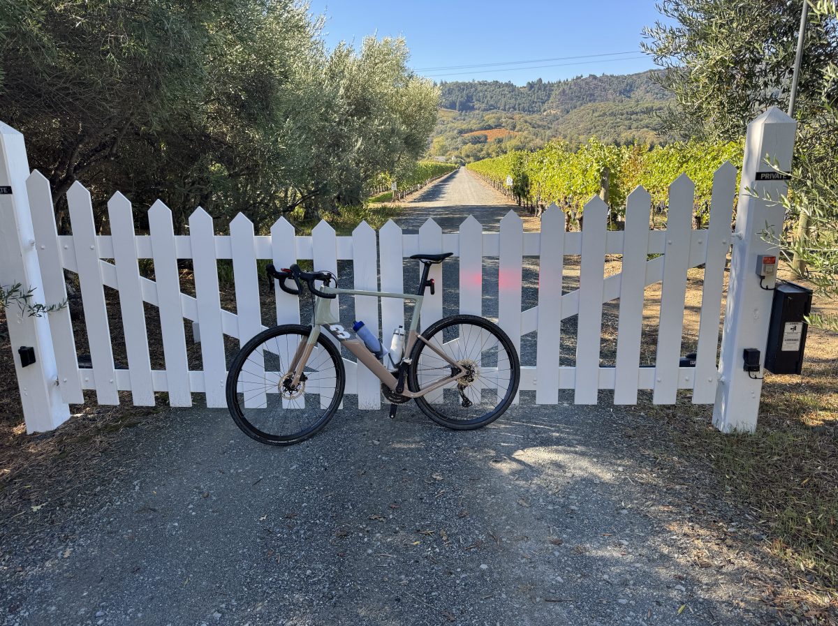 I ended up getting to the winery by about 9:35 (I may have “stretched” the speed limit “suggestions” on the 101…), put my bike together in a hurry, pumped up the tires, and we were on the road by maybe 9:41. No problem.