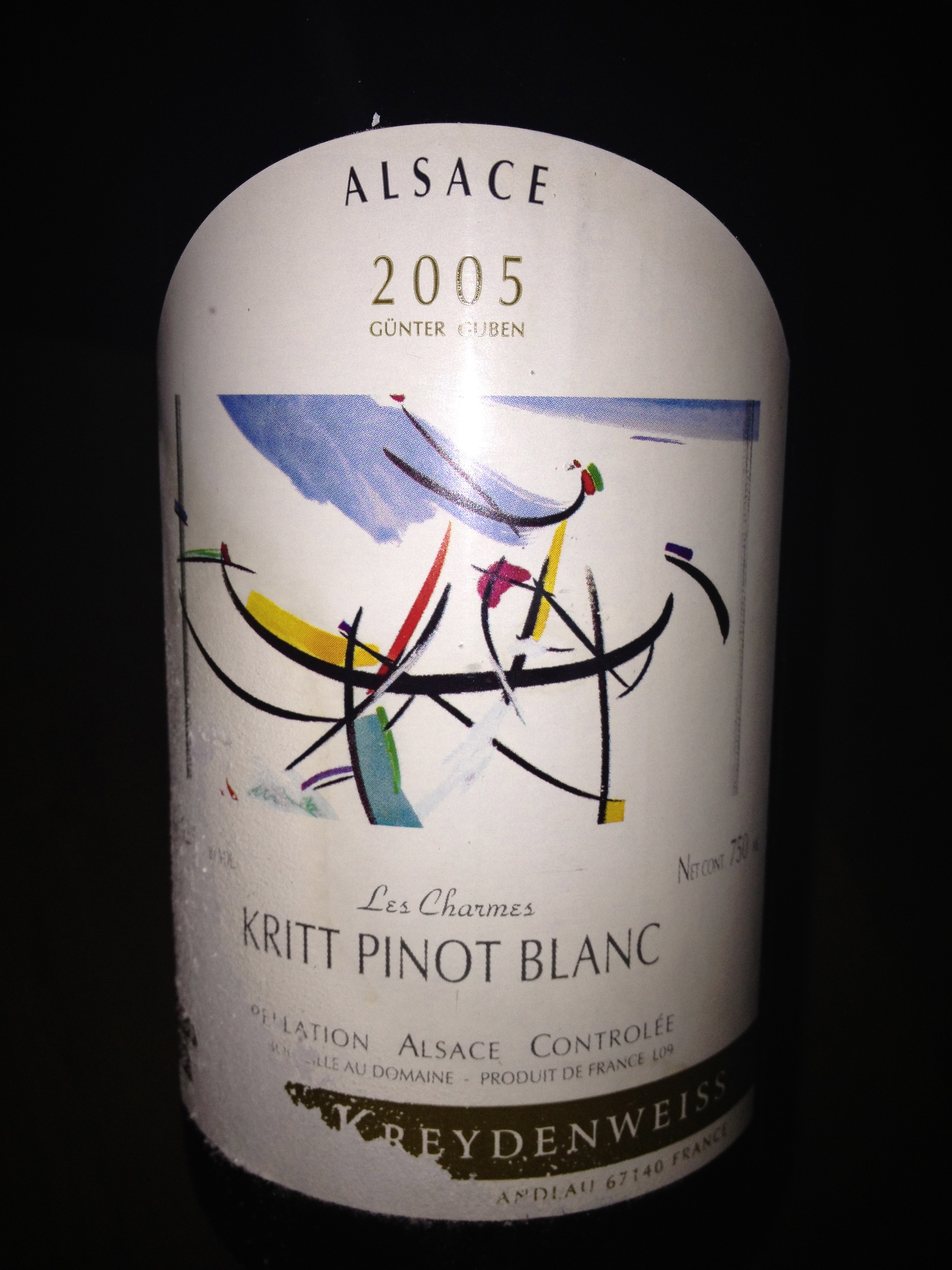 2005 Domaine Kreydenweiss Pinot Blanc Kritt les Charmes:  Retail ~$20. Purchased for personal consumption.  As I may have mentioned before, I consider Alsace my second home since I studied there for a year in college.  I have a fairly good collection of Alsatian wines, which I typically like to drink with a little age on them. I had a bottle of this a couple months ago and it was interesting, even good, but showed signs of being over the hill.  This one, I really have to call this one ‘flawed’. Dark golden color, notes of oxidation even caramelization on the nose. Tough getting past that. On the palate, more of the same. I have another bottle, ugh… Flawed, not rated. Since I still had one more bottle of this in the cellar, I decided that I might as well pull its cork as well.  Upon pouring it into the glass, it was clear that this one had issues as well–the dark yellow color was showing its ugly face again.  On the nose: oxidation.  On the palate, this one was not as far gone as the other bottle, but it was trying real hard to catch up….