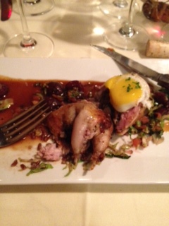 For the next course, I ordered the quail with a cherry reduction sauce, and my wife got some sort of fish.  I really did not pay all that much attention to her dish since mine was so flipping fantastic.  I easily won this round (not that I ever keep score–but I also crushed her at mini-golf earlier).