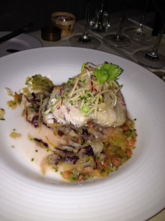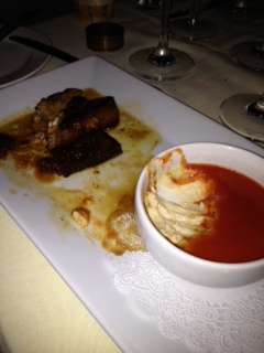 For the first course, our friends brought a Sancerre that they brought back from our recent trip (a wine that I also brought back). I had the escargots that I get just about every time since they are always spectacular (and I can never eat enough snails).  My wife got the fois gras.  She won, and it was not even close, the fois was unbelievably good.