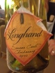 2010 Longhand Chardonnay Sonoma Coast: This wine was poured by Wilfred Wong, one of my heroes in wine. He is the Cellar Master for Beverages & More (BevMo), a chain of large stores in CA with a really great selection (unlike anything, say, in PA). Back when I lived out in Northern California, I would attend the many tastings he conducted at the BevMo right down the street from me.  Certainly California style chard with some subtle oak and good acidity. Wilfred says the wine maker feels that balance is over rated–and great flavor is much more important. Not sure I agree that one is above the other. 87 points.