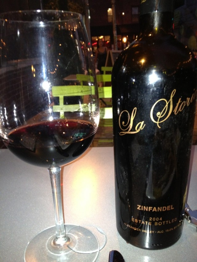 I eventually made it home without incident and strolled down to the ‘Lane’ (that is what all us hipsters call it). It was a beautiful night and nice and cool, so I ate outside. They had a great menu (it changes daily), and I was tempted by several other items, but I had been thinking about the burger for so long that day, there was no getting away from it. It was as outstanding as always. For the wine, I ended up going with a big Zin from Sonoma.