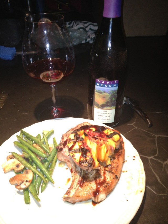 2004 Davis Bynum Allen Vineyard Pinot Noir: Retail ~$35. On sale at the PLCB for $10. This was the last of these bottles and I am sad to see it go. It has some nice fruit and good acidity, and it paired swimmingly with the grilled pork chop. Not overly complex, but a very nice wine–I wish I had more. Very Good. 89 points.