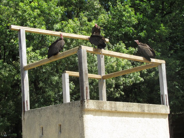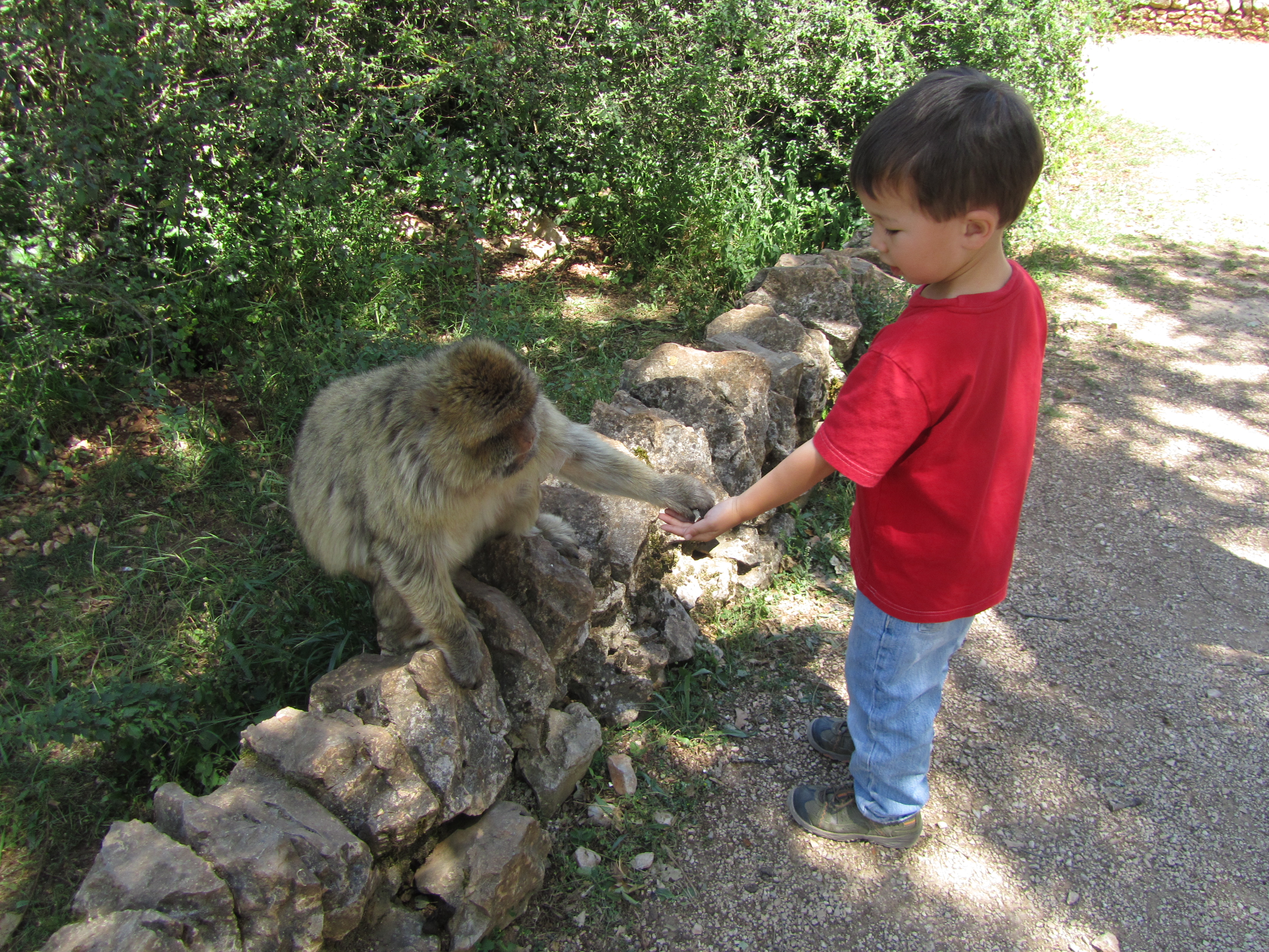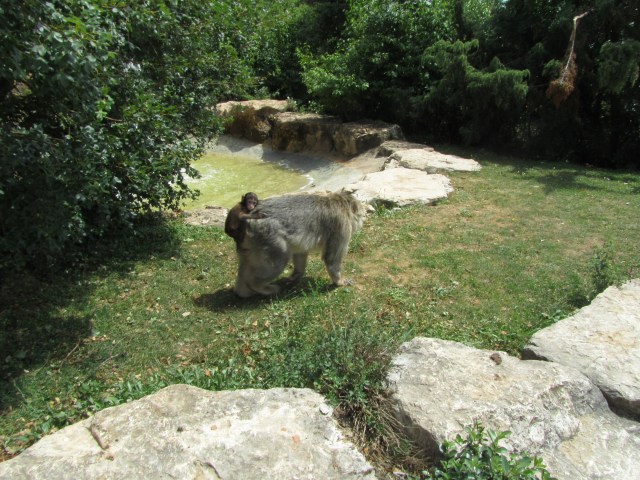 After Rocamadour, our friends left us to return to the house and the pool. We decided that we had not yet had enough of crazy half-wild/half-tame animal experiences, so we decided to head over to the Montagne des Singes which was right next to the Rocher des Aigles. There had also been something similar in Alsace, but we bypassed it since the literature was rather cheesy looking. This place had even cheesier looking advertisements, but the younger son likes monkeys, so we kind of had to go.