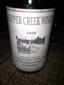 I checked my Cellar Tracker and after a fair amount of internal debate, I settled on a Carneros Chardonnay that I recently bought from Wines ‘Til Sold Out (WTSO), called Hopper Creek. It was from the Sangiacomo Vineyard in Carneros which has a fairly good reputation, so I figured ‘what the hell?’ It was $15/bottle and free shipping when you buy four.