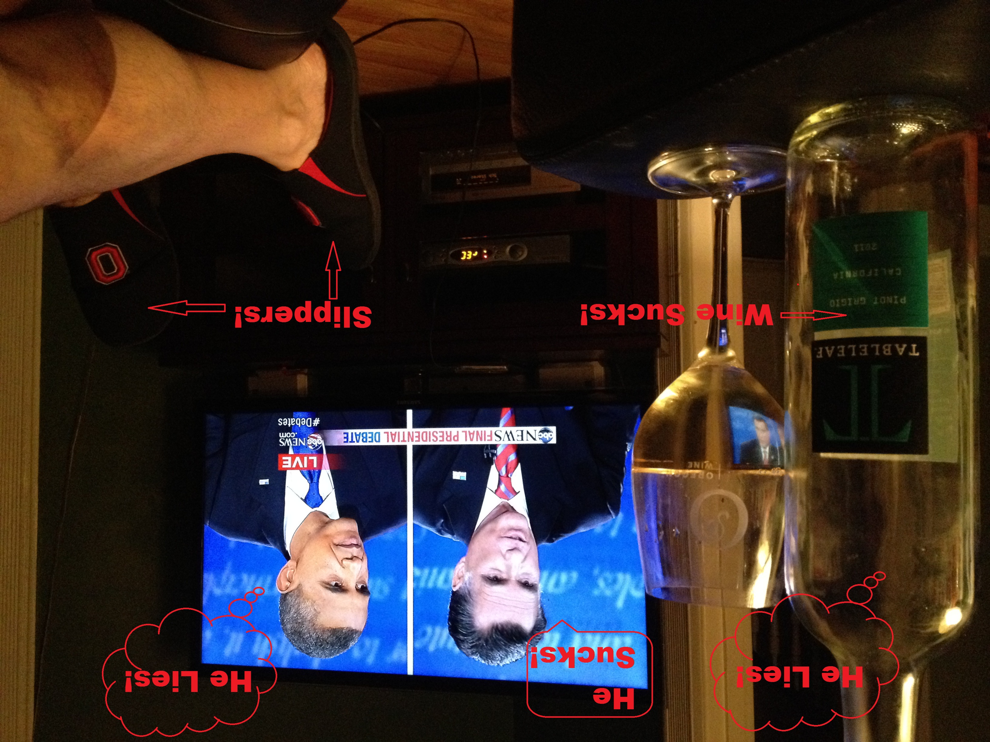 Having two boys at home, I pretty much get to watch that every day of the week. I did manage to have a little ‘wine’ while watching. I say ‘wine’ because, well, it sucked (‘you lie!’). I will be doing a little write-up for it in the next few days for the other site I write for: The Pennsylvania Vine Company, so I will not waste your time here, but I do have a quality pic from the debate: