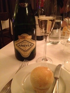 I make it back to the restaurant and my lovely wife in quick order. I sit down to peruse the menu as our waitron disappeared with our bottle of 2008 Argyle Brut to open (I was not sure why she had to take it to the backroom or why she did not just let me open it–I have not quite figured why the waiters still insist on opening the bottles at BYOs–I was not even remotely loaded at that point so perfectly capable of opening it myself). I let the bottle go with a minimal amount of anxiety and focused on my wife who was recounting elements of her day which she had spent at home with the boys who had the day off from school.