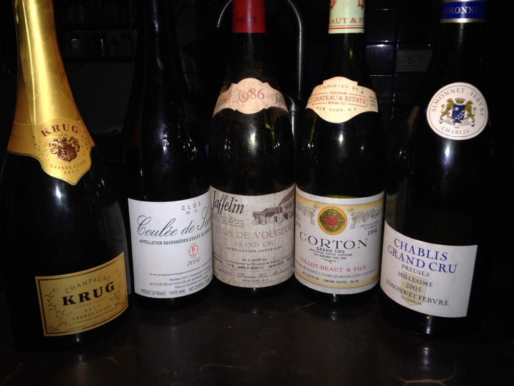 WINE OF THE WEEK: We had a very good friend join us this week for just a few short hours. When other very dear friends joined in, I decided it might be a night to pull a few special corks. All of them: NV Krug, 2006 Clos de la Coulée de Serrant, 1986 Jaffelin Clos Vougeot, 1994 Tollot-Beaut Corton, and the 2005 Simonnet-Febvre Chablis Les Preuses would all have been Wine of the Week had the others had remained on the rack. So instead of one Wine of the Week this go around, I have decided to have a Wine (Night) of the Week. That was this past Wednesday when we managed to get through all those bottles and still make it to work (early, even) on Thursday. I am sure I was not the only one to wonder what might have happened if this did not take place on a “school night.”