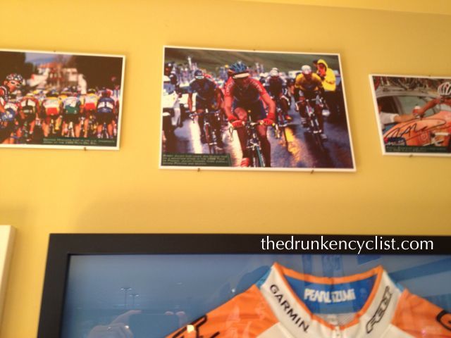 The tasting bar was a bit crowded, so I spent a bit of time strolling around the room looking at all of the bike porn. There were about a dozen bikes (all too small for me or else I would have been tempted to sneak one out under my shirt) and the walls were adorned with countless professional cycling photos. So while I gave the bar a bit of time to thin out, I circled the room to see if there was a photo of my friend, a former professional racer of significant acclaim. After a bit of searching, there it was: