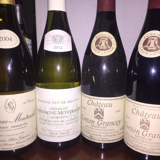 I thought about the evening for several days, wondering how to showcase the region’s cuisine and wonderful wines in just one night. My wife agreed to make her wonderful Bœuf Bourguignon (Beef Burgundy) and her incredible Tarte Tatin and I would select four wines: two whites (both Chassagne-Montrachet Premiers Crus from the Morgeot Vineyard) and two reds (both Louis Latour Corton Grancey Grands Crus). For both the red and the white, I bought a newer vintage from the state-controlled wine store to pair with an older, aged version from my cellar.IMG_4125