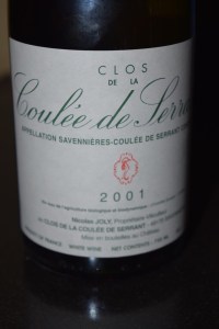 WINE of the WEEK: I know that every week, I say that I have a tough time trying to determine which wine should be the Wine of the Week, and each time I mean it. This week, however, not only is it tough to choose the WotW, but for the first time (at least the first time in a long time), every wine on the consumption list has a legitimate shot at the title (yes, even the oxidized ’04 Blain-Gagnard Chassagne–OK, all but that one). First, there was the ‘03 Hubert Lamy Saint-Aubin 1er Cru en Remilly, which followed on the heels of the ill-fated Blain-Gagnard (these days, due to all the premature oxidation I have had with white Burgundy, I always chill two when people are coming over and pray that one of them will be OK), as it restored my faith (if ever so slightly) in how great old white Burgundy can be. As I mentioned in the note, I really try to hate the Château Miraval Rosé, but there is no way I can since it is one of the best rosés on the market, particularly in its price range. Then there is the ‘00 Pommery Cuvée Louise Rosé, which is a special bottle of wine by any measure. This is the type of champagne that is right in my wheelhouse that I would drink every day, forsaking all others, if I were the type that could afford to run for President. In the end, though, I opted for the 2001 Nicolas Joly Clos de la Coulée de Serrant. Why? That is a fairly good question. If you have not had Savennières, well you should, and if you want to double up, go for some Clos de la Coulée de Serrant. While not all would agree that this is the top parcel of land in the region (and fewer would agree that Nicolas Joly is the top producer), almost all would agree that the wine is legendary, as grapes were first planted there in 1130. Yeah, that was eleven thirty, as in almost a thousand years ago.