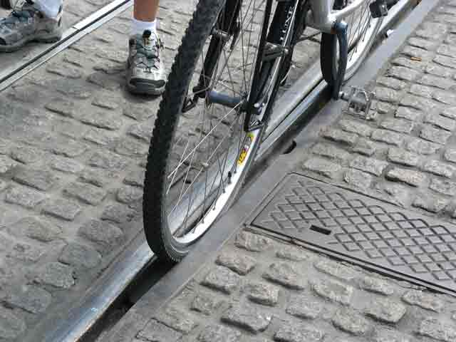 The trolley driver quickly descended from his car, with the universal “boy, are you an idiot” look on his face. He came to the front of the bike where he grabbed the handlebars and wiggled them back and forth while simultaneously lifting up. After just a couple of shimmies, the front wheel was free.