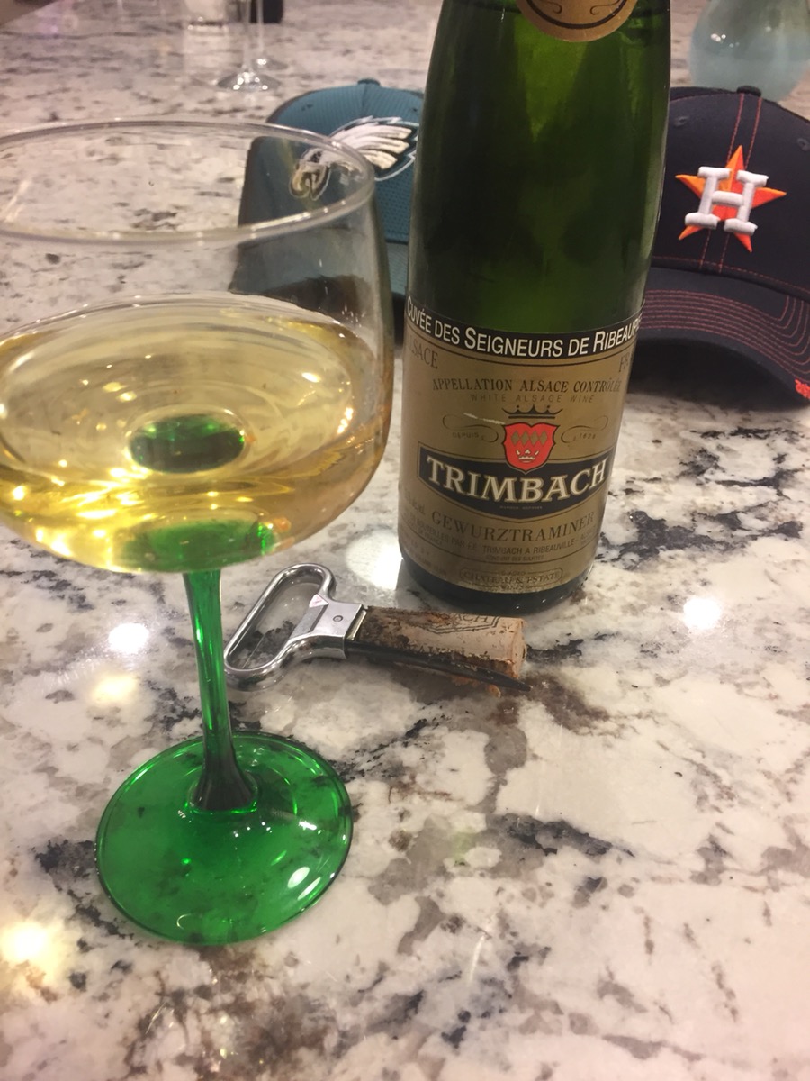 WINE OF THE WEEK: Looking over the wines from this past week, I see that I rated them all “Outstanding” (a couple were on the cusp, but that detracts slightly from the point I am trying to make here, so just roll with it), which seems to be happening with a bit more frequency recently. That either means that my assessments are suffering from grade inflation (an affliction that I fervently tried to avoid as a high school then college teacher) or I have some decent wines in my cellar that benefitted from some extended cellar time (my wife strenuously protests extend cellar time until she tastes the older wines). I am choosing to believe the latter, naturally. Both of the reds were magnificent—I had a feeling the 32 Winds would be such, given its pedigree, and the Erbice Amarone was a welcome surprise. That Gallimard Champagne is an incredible deal at $22 and proof that there are some solid choices from the Côte des Bar despite what most “traditional” Champenois would have one believe. This week, however, I returned to my roots, so to speak, and opened one of my older wines from Alsace, a region that I like to call my second home. I studied and played basketball there many years ago and became enamored with the region and its wines. I have been back several times since and it is difficult for me to name a region in France that delivers on more levels: wine, cuisine, culture, history, natural beauty, and of course, great cycling. Thus, this week the 2001 Trimbach Gewurztraminer Cuvée des Seigneurs de Ribeaupierre is my Wine of the Week. Not only does it provide some lovely memories from my “home” it also exhibits what Gewurztraminer is supposed to be.