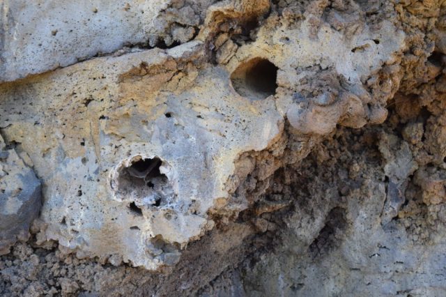 The property has been covered in volcanic ash and lava countless times over the centuries. Here is some volcanic rock that formed after an eruption in the 16th Century. The holes were made by trees that were consumed by the flow of lava and have since rotted away.
