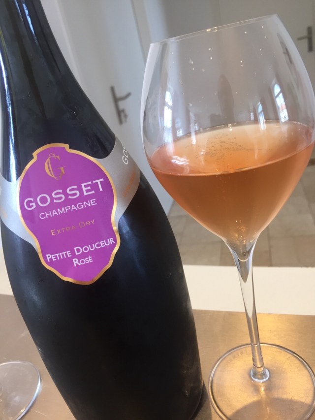 NV Gosset Petite Douceur Rosé Extra Dry: Retail $80. 60% Chardonnay, 40% Pinot Noir (including 7% red wine). 17 grams sugar.The red fruit really pops out of this light salmon color sparkler. Only slightly sweet. Just slightly but it works really well. Fruity and delightful. Great with fresh raspberries no doubt. Outstanding. 90-92 Points.