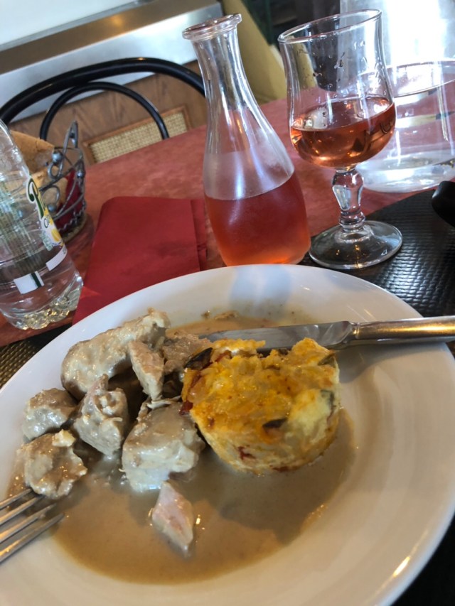 Un quart (25cl) of Rosé from Coulanges la Vineuse. 6€. The following day, I was out on my bike, on the way to Avallon, where I would hopefully make the afternoon train back up to Paris in time for dinner. It was just after noon and I knew that right after the town of Châtel-Censoir (where I was), there was a significant climb up to the abbey town of Vérzelay (although I had forgotten what a steep climb it was), so I thought I should eat a bit. There are just a couple of restaurants in the tiny town and I pulled into the only one open. How to describe the establishment? A “hole in the wall” is not sufficient–by American standards it was decidedly a “dive.” I was met by a guy in black acid wash jeans and what could only be described as a “pornstar mustache” and I was a bit worried. He turned out to be an exceedingly nice guy, but that did little to alter the surroundings. There was no carte (what we call a “menu” in the U.S.), just two choices written on a little chalkboard in the corner for 13€20 which included a buffet of an assortment of sketchy food under a quasi-cover. The buffet dishes looked like they had been there since Tuesday. And it was Monday. But the beets and the melon were both fresh and tasty, so I opted for two helpings of each, before the waiter brought out the main course I ordered, the sauté de porc in a mustard sauce. Simple but tasty. I also ordered a 25cl of the local Rosé: Coulanges la Vineuse. Like most in the restaurant, it was modest and unassuming, but there was decent fruit and hit the spot on a hot day. Had I known the killer climb that was ahead of me, I would have ordered a demi (50cl) so that the subsequent pain would have been more thoroughly numbed. Good to Very Good. 85-87 Points.