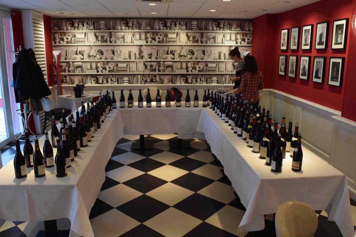 I headed over to the room where we would be conducting the tasting. Whoa. There were approximately 125 bottles of Moulin-à-Vent from various producers set up on a horseshoe-shaped series of tables and I was tasked to taste them. All of them. In three hours. I was not a math major (it was actually one of my two minors), but that leaves not even a minute and a half for each wine (one minute and 26.4 seconds for those keeping score at home).