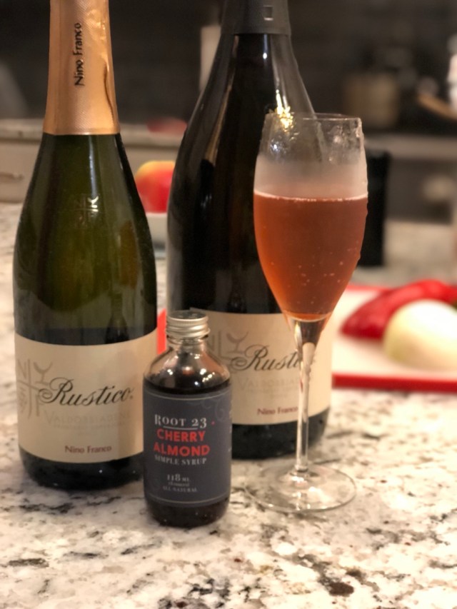 We have expanded past Chambord (a raspberry liqueur that is, frankly, not as good as it used to be), and have made Kir Royales with all sorts of liqueurs and syrups. Recently, I was sent a couple of bottles of my favorite Prosecco, Nino Franco, and two bottles of flavored syrup from Root 23 simple syrups to make Kir Royales–a perfect cocktail for this time of year.