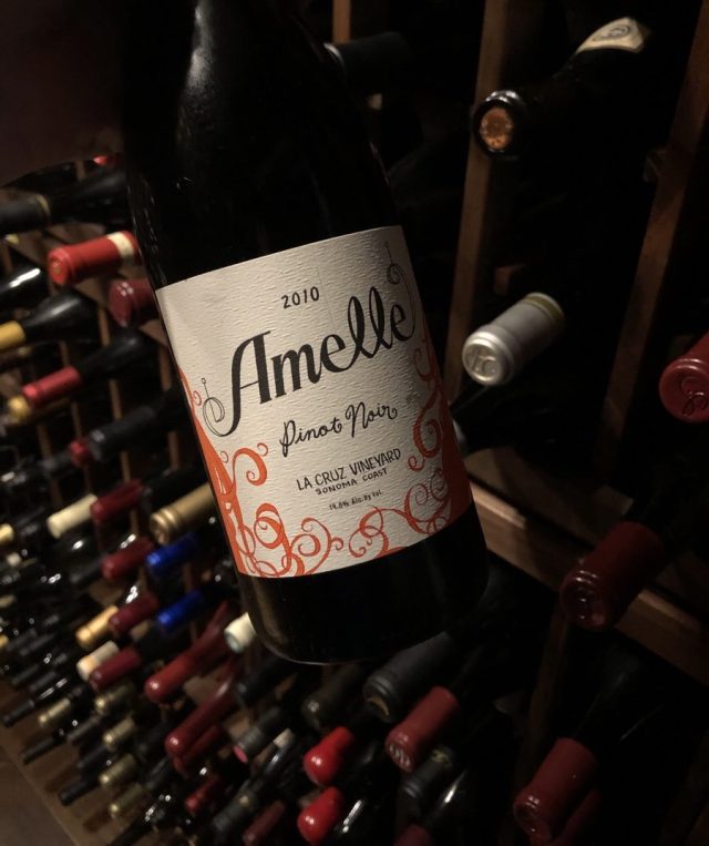 WINE OF THE WEEK: This week, while the final choice was not particularly easy to select, it was fairly easy to eliminate several contenders for the Wine of the Week. The Château de Beaumont was perfectly fine and fun to drink, a wine that is older than one of my kids, but that was pretty much the end of the intrigue. My wife drank the Kosuge Shop, not saving me even a sip, so…. The Château du Rouët Rosé was quite tasty and a surprise to find in the cellar, but I forgot to take a photo and it was my only bottle, so…. That left two. The Cosentino Poet is always one of my favorite wines, but new vintages are not even close to the quality of these older bottles. In a similar vein, there will be no more Amelle wines produced at least for a while (I am holding out hope that Eric, the winemaker, will get back in the game at some point). In the end, I opted for the 2010 Amelle Pinot Noir La Cruz Vineyard Sonoma Coast as this week’s Wine of the Week. There is no doubt that it is a stellar wine, drinking beautifully, and I have another bottle (so I could take a photo).