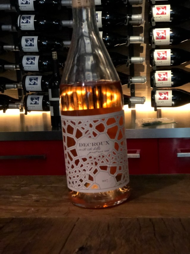 2017 Decroux Pinot Noir Rosé, Santa Rita Hills, CA: Retail $38. Strawberry, melon, a bit of cherry, and plenty of wet rock. Light on the palate but good tartness. Solid flavors and really well done. I am not usually a fan of saignées, but this is lovely. Excellent. 90-92 Points.