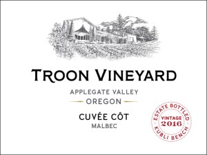 2016 Troon Vineyard Cuvée Côt, Applegate Valley, OR: Retail $40. 100% Côte (Malbec). Being a Francophile, I love the fact that Troon uses the local French name for two of their varietal wines (Rolle for one of their Vermentinos and Côt for this Malbec). I also love that their wines are quite tasty. Fairly dark with sweet, rich red fruit on the nose. The palate is tart, but also rich, with oodles of fruit–this is an easy drinking wine with plenty of body and flavor. Very Good to Excellent. 88-90 Points.