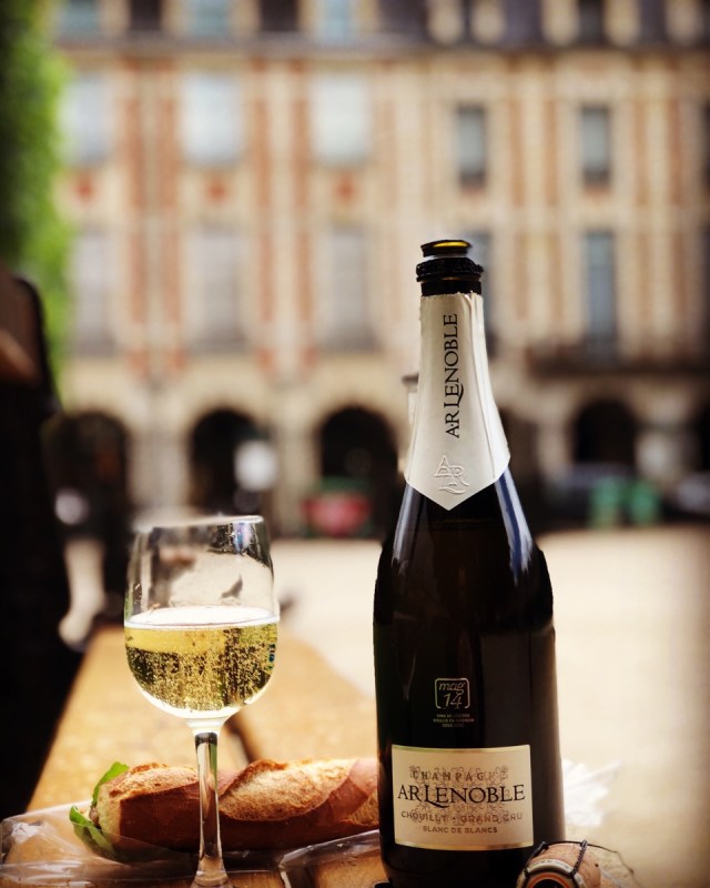 I had this fabulous bottle of champagne with a glorious sandwich on the Place des Vosges.