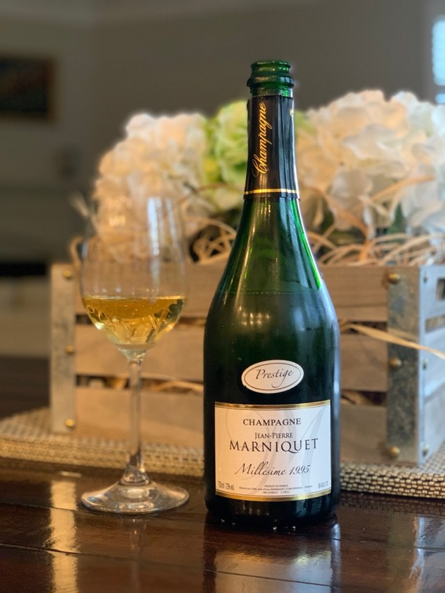 WINE OF THE WEEK: As I mentioned in one of the notes above, my wife has become a real champagne hound, but it was not always that way. In fact, I can still recall a time when I was pretty much on my own once a cork was popped and the bubbles began to flow. That has all changed. So much so that an open bottle now has become essentially a race to get to the last glass. Wisely, I have instituted a “three fingers” rule–she needs to leave three fingers worth of wine in a bottle so that there is enough wine remaining to write at least a semi-coherent note. This new rule has been met with resistance, particularly when it involves champagne, specifically really good champagne. Such was the case with this week’s Wine of the Week, the 1995 Jean-Pierre Marniquet Champagne Prestige Millesime. Even though it is a vintage wine, and an aged one at that, I am surprised I liked it so much. Why? Well, I am usually not that much of a fan of Pinot Meunier, and the Marniquet is loaded with it. What does it mean? I guess I have the ability to adapt? Nah, that can’t be it.