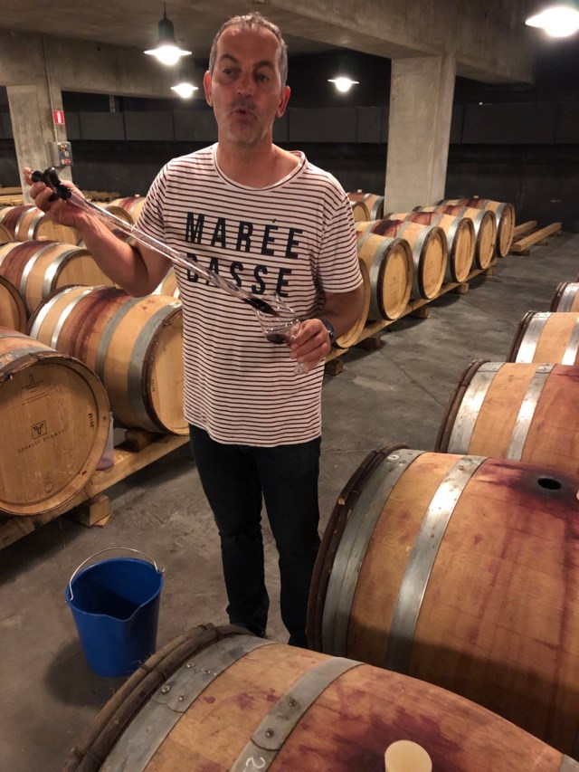 Denis Lapalu stealing a bit of wine from a barrel to taste.