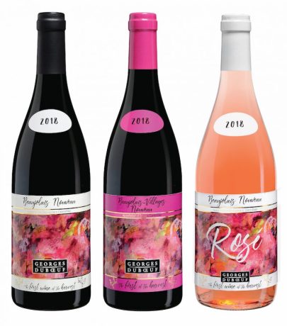 Since 2017, Les Vins Georges Dubœuf has conducted a yearly competition to determine the design for the coming vintage of their ubiquitous Beaujolais Nouveau bottles. This past vintage, the 2019 bottles sported artwork by Dallas artist Laura Runge.