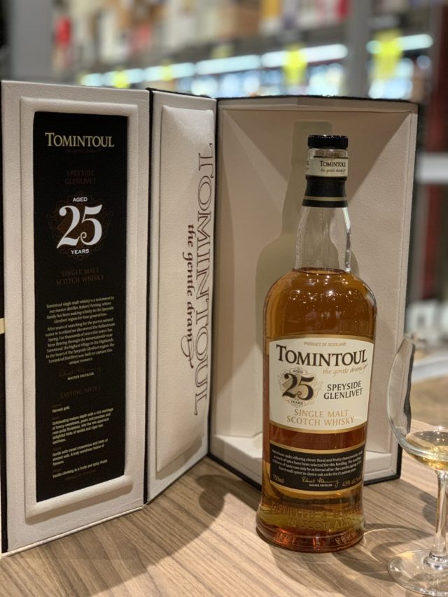 Tomintoul 25-year, Single Malt Scotch Whisky, Speyside Glenlivet: Retail $450. Very small batch. 43% ABV. I am not sure why an extra four years of ageing results in a tripling of the retail price (the 21-year is around $150), but… Wow. Baked chocolate chip cookies or even a freshly baked pain au chocolate. Wow. And whoa. Holy cow this is lovely. Outstanding. 95-97 Points.