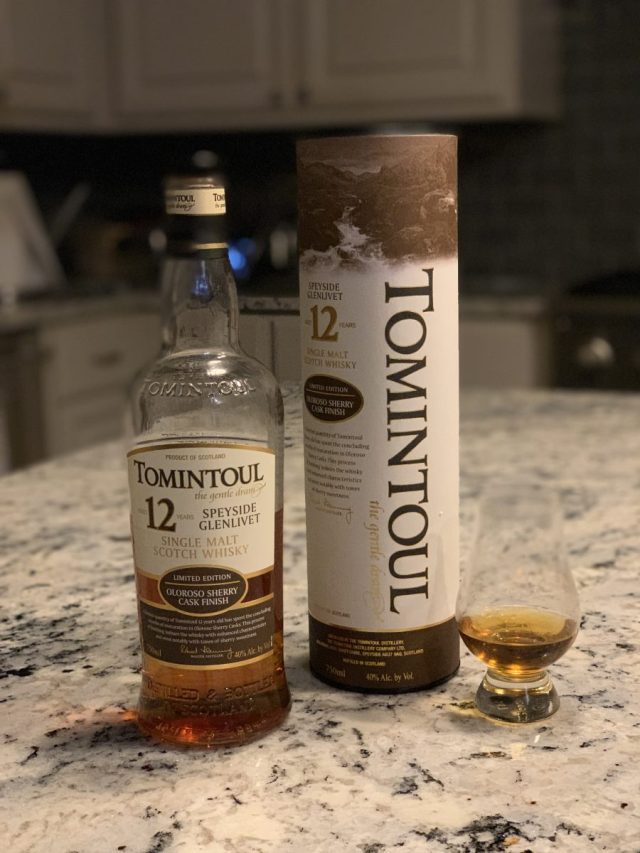 Tomintoul 12-year, Single Malt Scotch Whisky, Limited Edition Oloroso Sherry Cask Finish, Speyside Glenlivet:. Retail $72. 10 years in bourbon casks then 2 years in Sherry casks. Decidedly sweeter on the palate with more vinous aspects: vanilla, plump raisin, and a lovely sherried characteristic on the nose. The sweetness is also noticeable on the palate along with cherry and red fruit. Medium-bodied. Excellent. 90-92 Points.