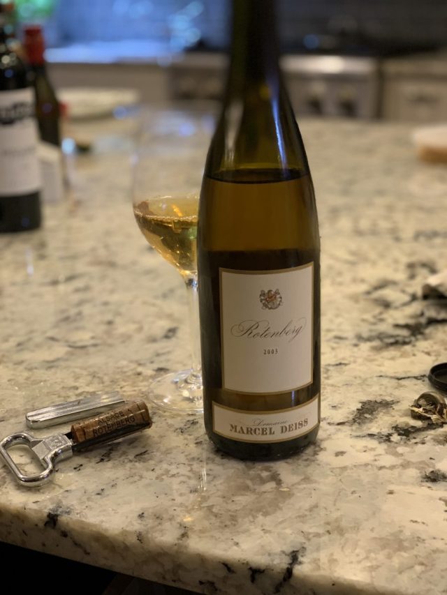 WINE OF THE WEEK: This week, I vacillated at least a couple of times between the 2011 Clos Pepe Pinot Noir and the 2003 Marcel Deiss Rotenberg in choosing the Wine of the Week. On one hand was the Clos Pepe, one of the best Pinots I have had this year. On the other was the Deiss Rotenberg, a beautiful wine from one of my favorite regions in the world. I think my wife would have chosen the former, as it was a Pinot “right in her wheelhouse” (her words). But she does not write this column (although she is required to write tasting notes when I am out of town). Therefore, I opted for the 2003 Marcel Deiss Rotenberg as the Wine of the Week. In part, obviously, because it was an excellent bottle of wine, in part because it comes from a favored wine region, perhaps the most under-valued region in France, and in part because I remembered to take a photo of my final bottle of this wine (I still have a few bottles of the Clos Pepe).