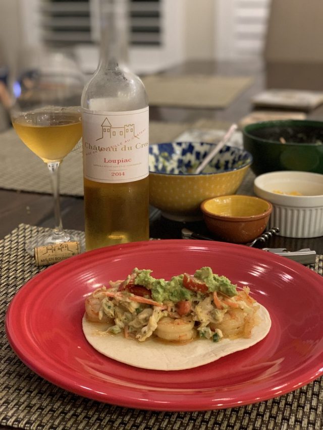 After years of resistance, I finally succumbed to my basketball-obsessed boys’ request to rebrand the second night of the school week as “Taco Tuesday” (they claim the term was invented by LeBron James and I feel no need to argue this point). Thus, on any given Tuesday, we will invariably have some iteration of that theme including fajitas, enchiladas, even nachos. I typically slowly cook the shrimp (usually over about 30 minutes), which gives me time to make the Greek yogurt-based slaw (into which I sneak a few jalapeños) and my garlic-rich guacamole. Together, it seemed like a good pairing with two traditional wines from Loupiac.