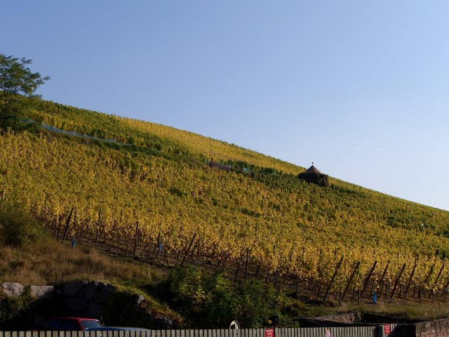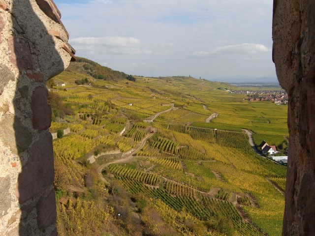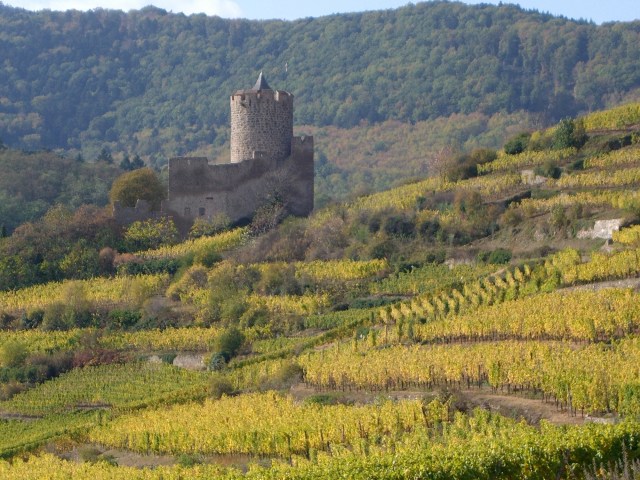This is a view of the castle of Kaysersberg across the Schlossberg Grand Cru vineyard.