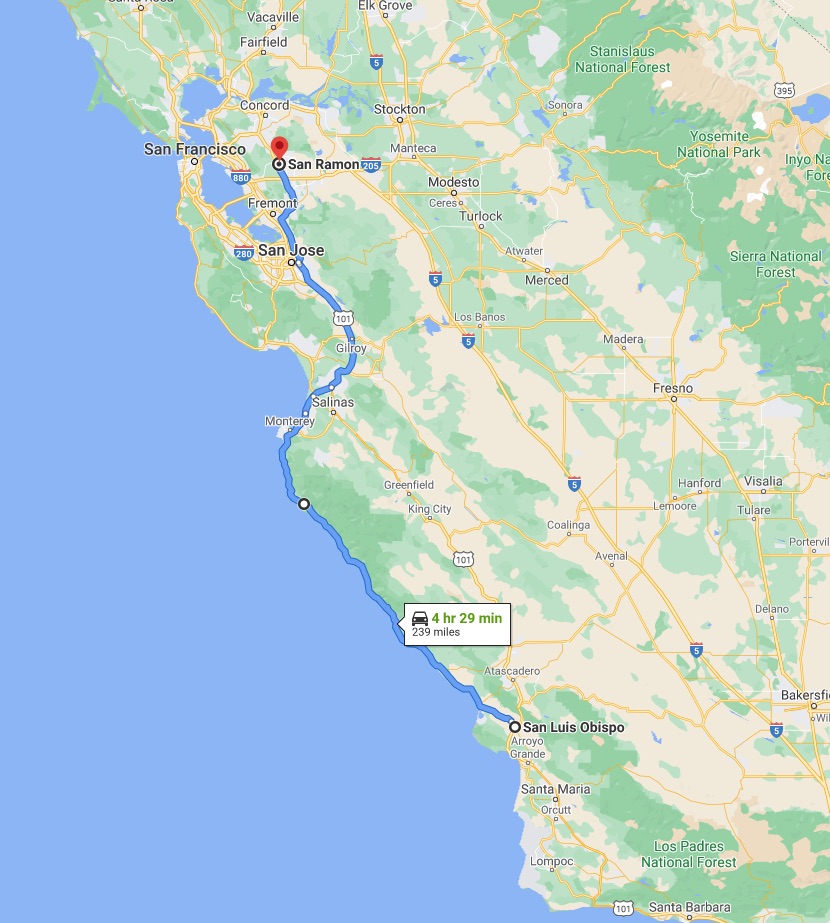 Thus, my GPS was proposing a different route, that simply took 101 North from San Luis Obispo all the way to San Ramon. Now, the 101 is a fine highway, much more picturesque than say, I-10 here in Houston or the Jersey Turnpike, but it is certainly no Route 1.