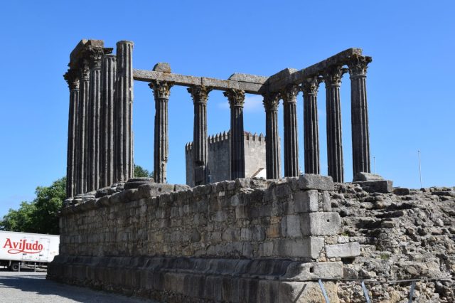 Évora was a Roman outpost and there are many ruins that remain in the city, including the Templo de Diana, in the center of town, at highest point in city. The style is 1st century Corinthian, built with local materials, to be the Roman forum. It was thought to be built for Diana the goddess of the hunt, but in the 1980s it was discovered that it was actually built for Emperor Augustus. After the fall of the Roman Empire, the Visigoths destroyed most of what existed.
