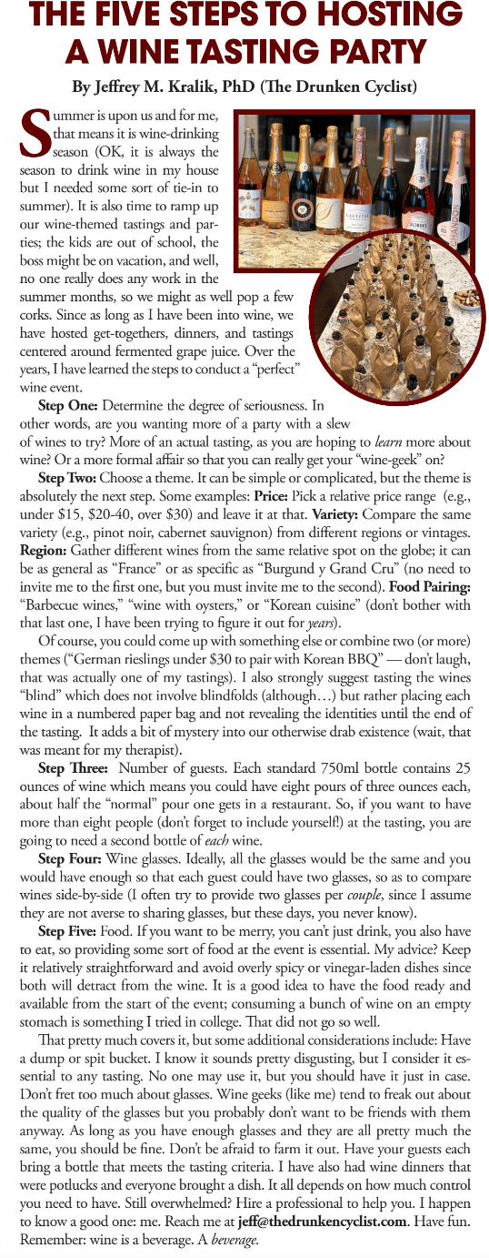 Over the weekend, my July article was published in two local magazines. This month, I provide the five key steps to hosting a successful wine-tasting party. Please check out either (or both) by clicking on the screenshots below and let me know what you think!