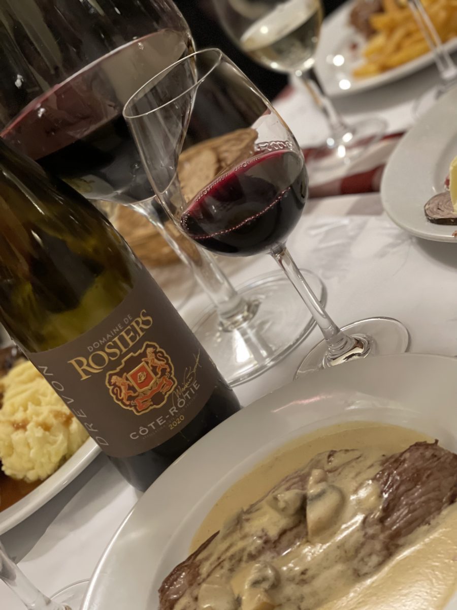 2020 Domaine des Rosiers Côte Rotie, Rhône Valley, France: Restaurant 80€. We found a tiny little place in the 2nd Arrondissement that would take a party of five well after the dinner crowd began arriving. The waiter, although quite French, was also quite the character, upselling at every possible point. The menu was decided slanted to the meat eater with every selection containing a portion of a previously living animal. Side of beef. T-Bone of veal. Roast pork. Tartare. Lotsa tartare. There was nary a fish to be found and only one dish that would have classified as “vegetarian” (although if I had mentioned that fact it probably would have been immediately stricken from the menu). I asked the waiter about his preference between a Saint Joseph (50€) and a Cornas (65€), and he immediately upsold me to this Côte Rôtie. Whoa. Great fruit and intense spice on the nose, and I knew immediately that it would pair fabulously with the fare from the restaurant. The palate? Dark fruit, even really dark on the palate, with spice and anice floral note. Lovely. Fruity, tart, nuanced, and more than an ounce of verve. Nice. Excellent. 92 Points.