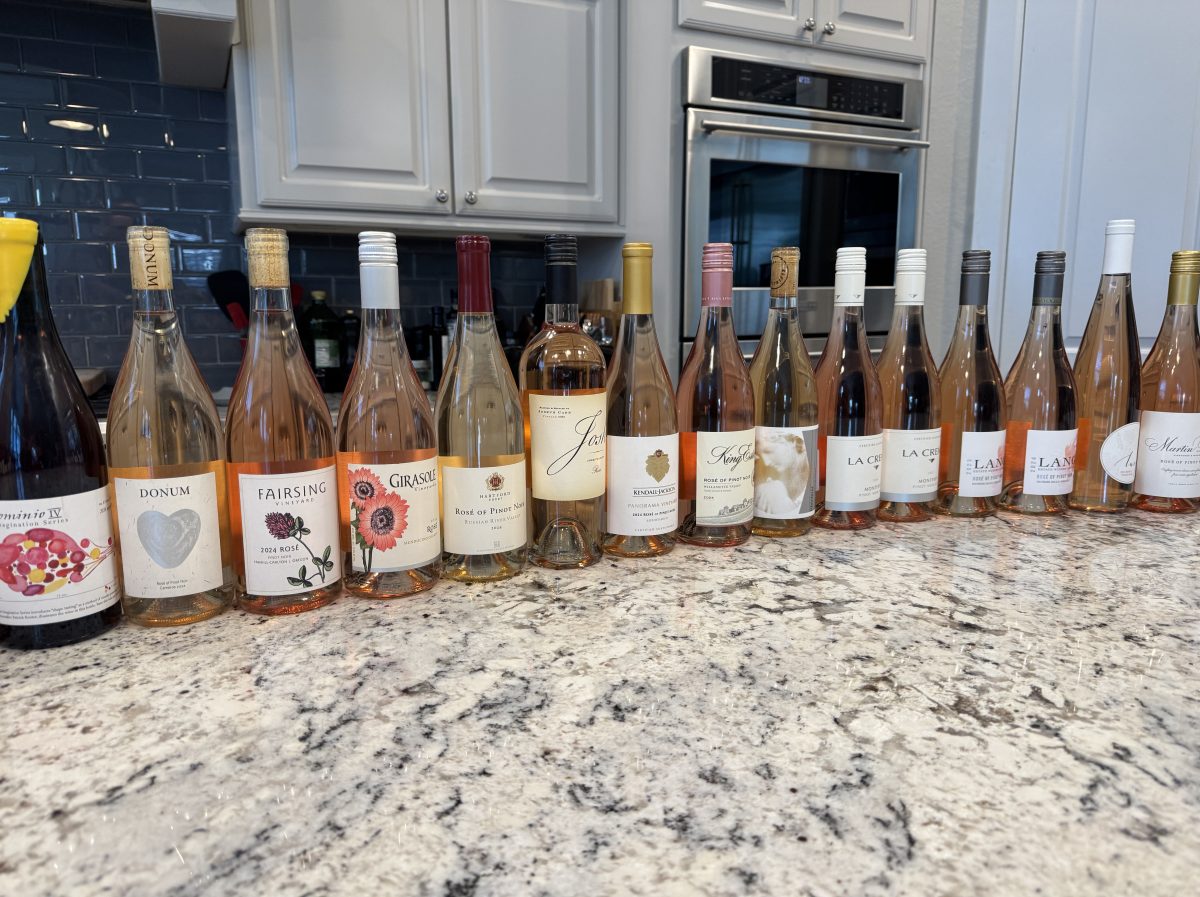 This past weekend, I invited a few wine professionals here in Houston to my house for what I believe to be the largest blind tasting of American True Rosés, This year we tasted 52 wines, which was a bit less than last year’s 64,  (two years ago there were 53,  three years ago there were 51, four years ago, we had 68, five years ago we tasted 74, in 2019 there were 54, 68 in 2018, and the first year we had 36), while maintaining physical distance (for the most part).