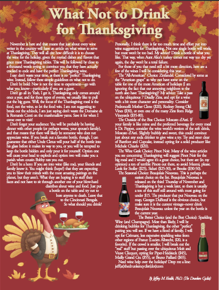 Since this holiday, perhaps more than any other, means spending time with family, however, wine at the big meal is not only desired, it is required. But instead of telling you what to do, when selecting a bottle (or in my case, bottles, many, many bottles) for the big event, in this month’s Spring Branch Plus Magazine, I offer my thoughts on what not to drink on the fourth Thursday of November.
