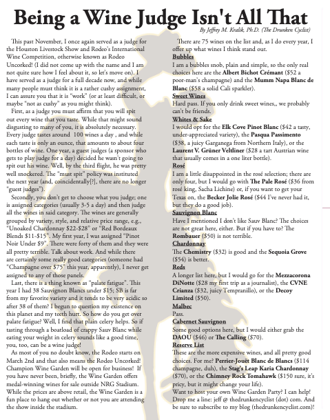 As some of you may know, for the past nine years, I have served as a judge for the Houston Livestock Show and Rodeo’s Wine Competition (one of the largest in the country) and in this month’s article in the Spring Branch Plus Magazine, I look over the menu at the Rodeo’s Wine Garden and offer my picks as the “wines to drink” while visiting the event.
